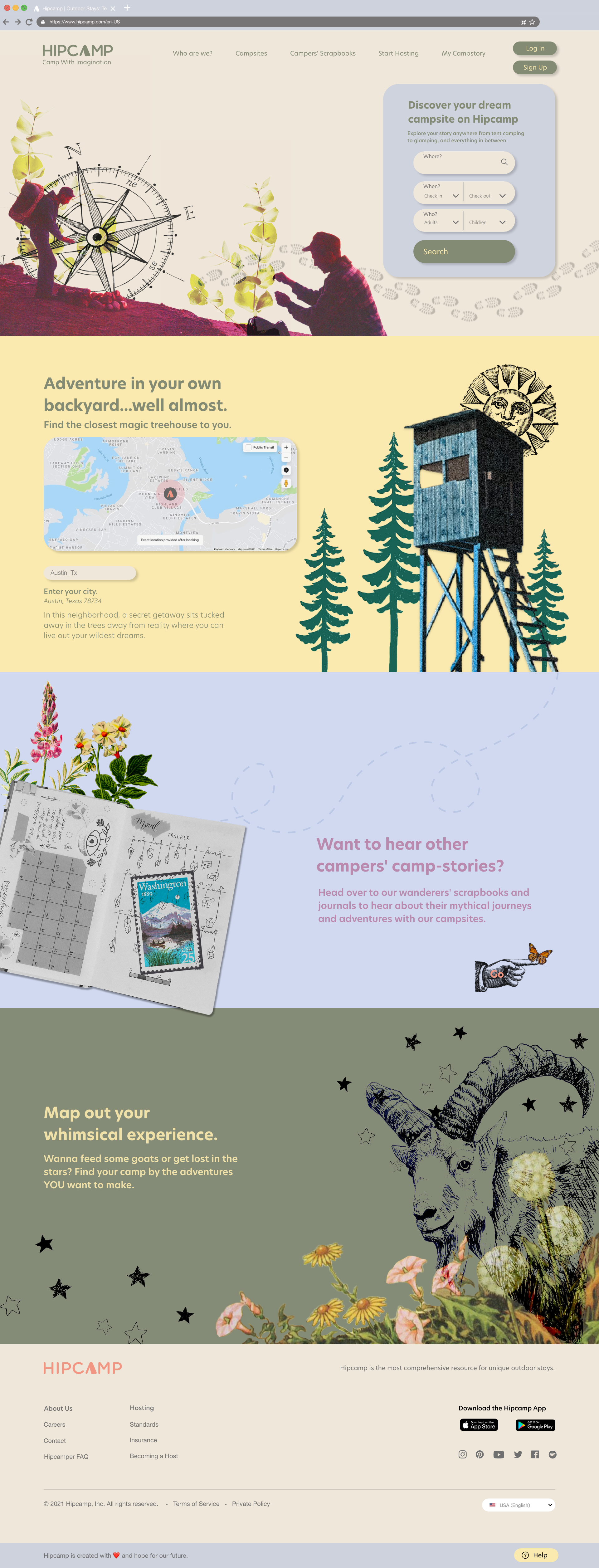 Hipcamp is a campsite booking platform that offers over 300,000 camping options all over the world from glamping to treehouses to primitive sites. For this project we rebranded Hipcamp and gave it an imaginative style to be more inviting for all campers to be creative with their camping journey.